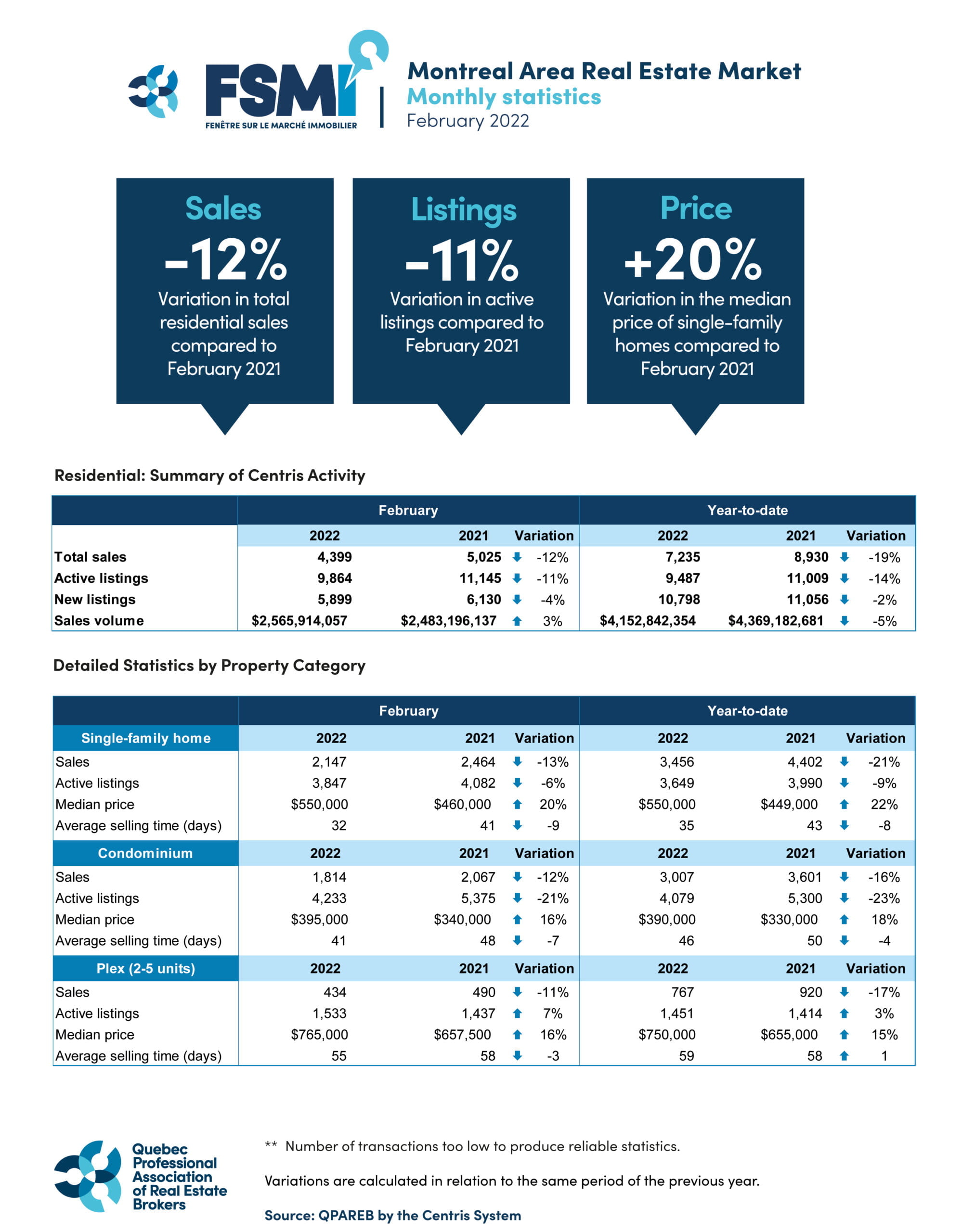 2022年3月3日 – 根据大魁北克省房地产协会(QPAREB)2022年2月Centris®销售统计数据表明,蒙特利尔房产市场2月份房产的总交易额为4,399笔,与去年同期相比下降了12%,但是这主要是因为2021年2月份的房产销售由于疫情反弹特别地火爆,其实今年2月份的销售额已经是2016年的水平了,那年共有4,400笔交易。
