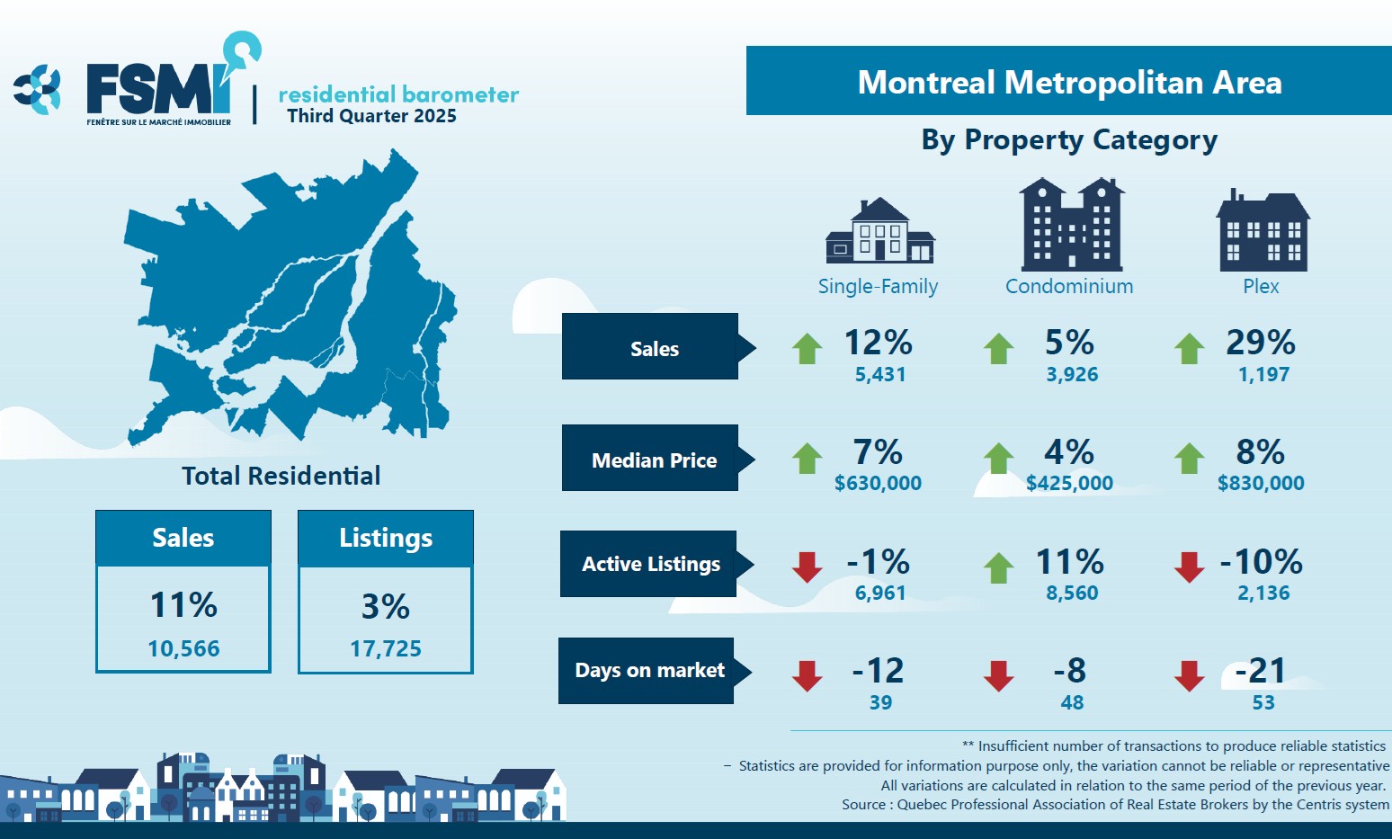 2025年10月14日 – 根据大蒙特利尔房地产协会(GMREB)2025年第三季度Centris®销售统计数据表明,在蒙特利尔大都市区2025年第三季度的房产市场上,总共有10,566笔交易,与2024年同期相比增加了11%,这已经是连续第7个季度房产交易量上涨了。